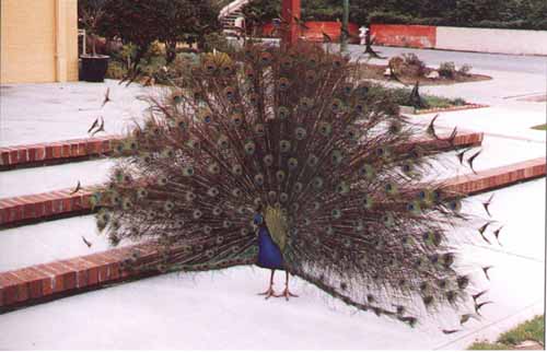 Peacocks wander around the monastery Peaceful and quiet roads